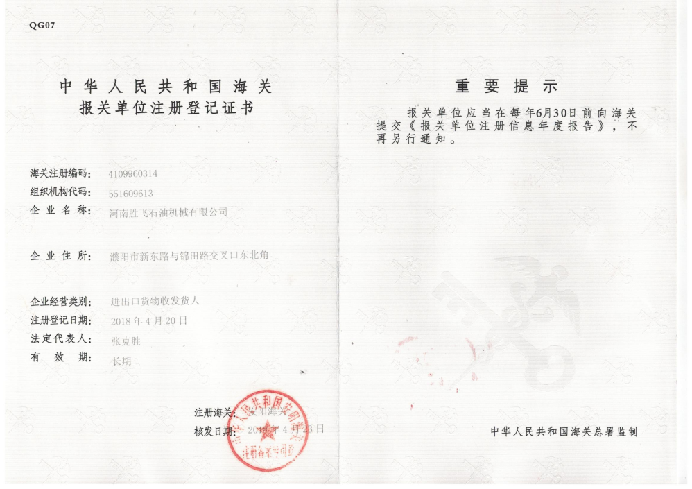 • 海關(guān)報關(guān)單位注冊登記證書